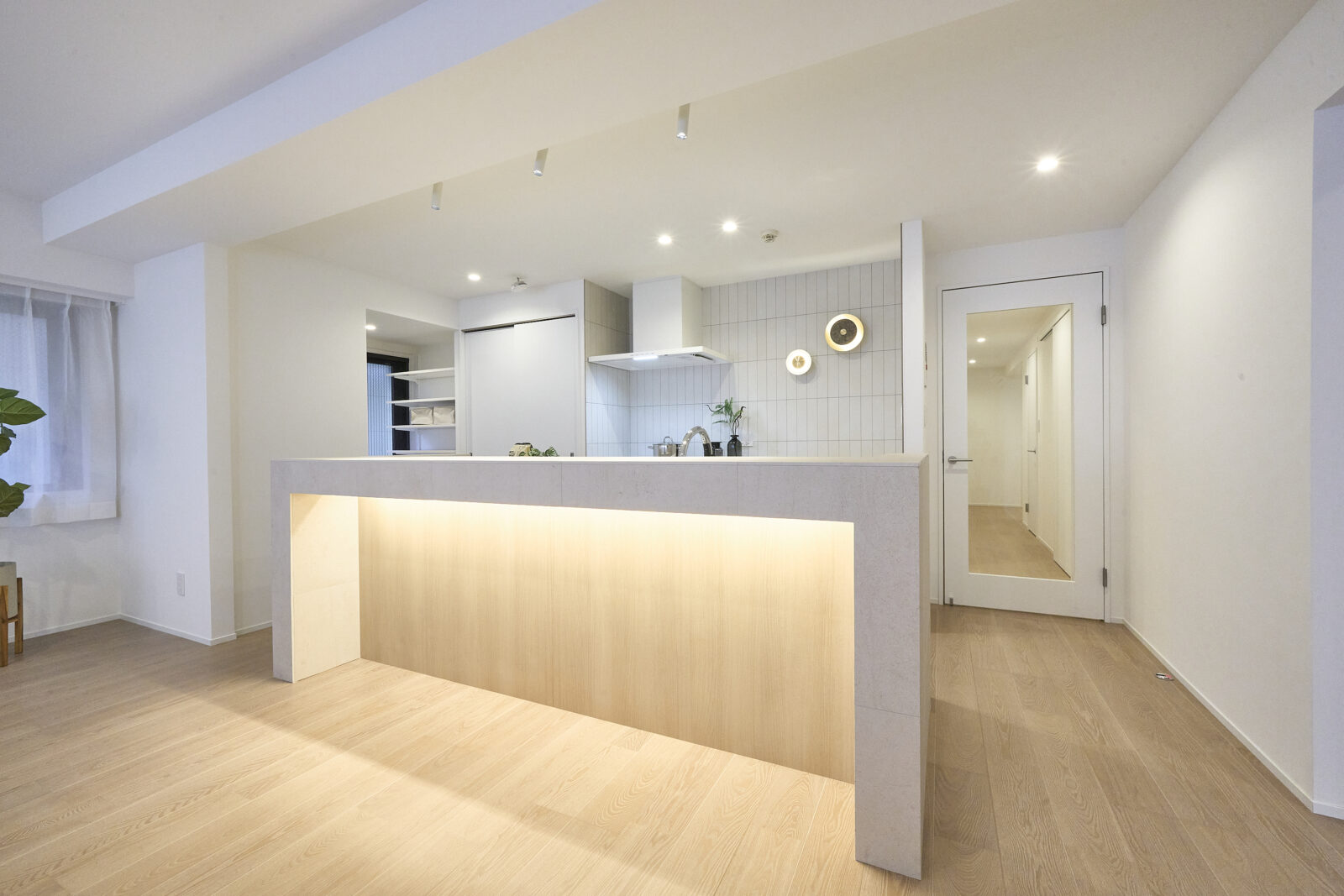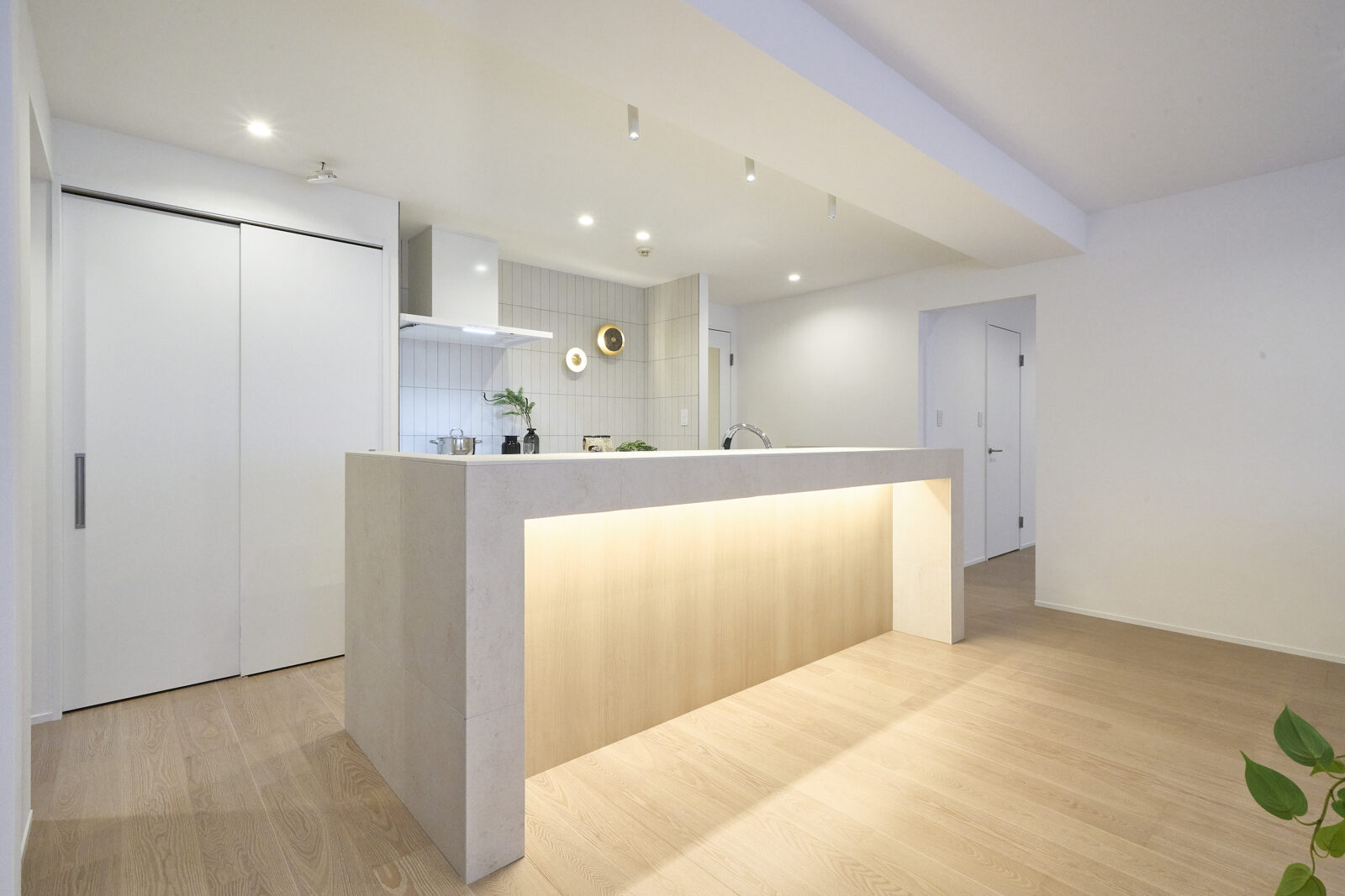 カウンターに並べられた彩り豊かなオードブルと、グラスの中で氷がカランと鳴る音。 「今日のごはんなあに?」と覗き込んでいたお子様たちの日常の風景が、今夜は大切な友人たちとの賑やかな社交場(プラットフォーム)に。 たっぷりの収納が生活感を鮮やかに消し去っているからこそ、ゲストは目の前の料理と会話、そして石と光が織りなす静謐な情景に没頭できるのです。