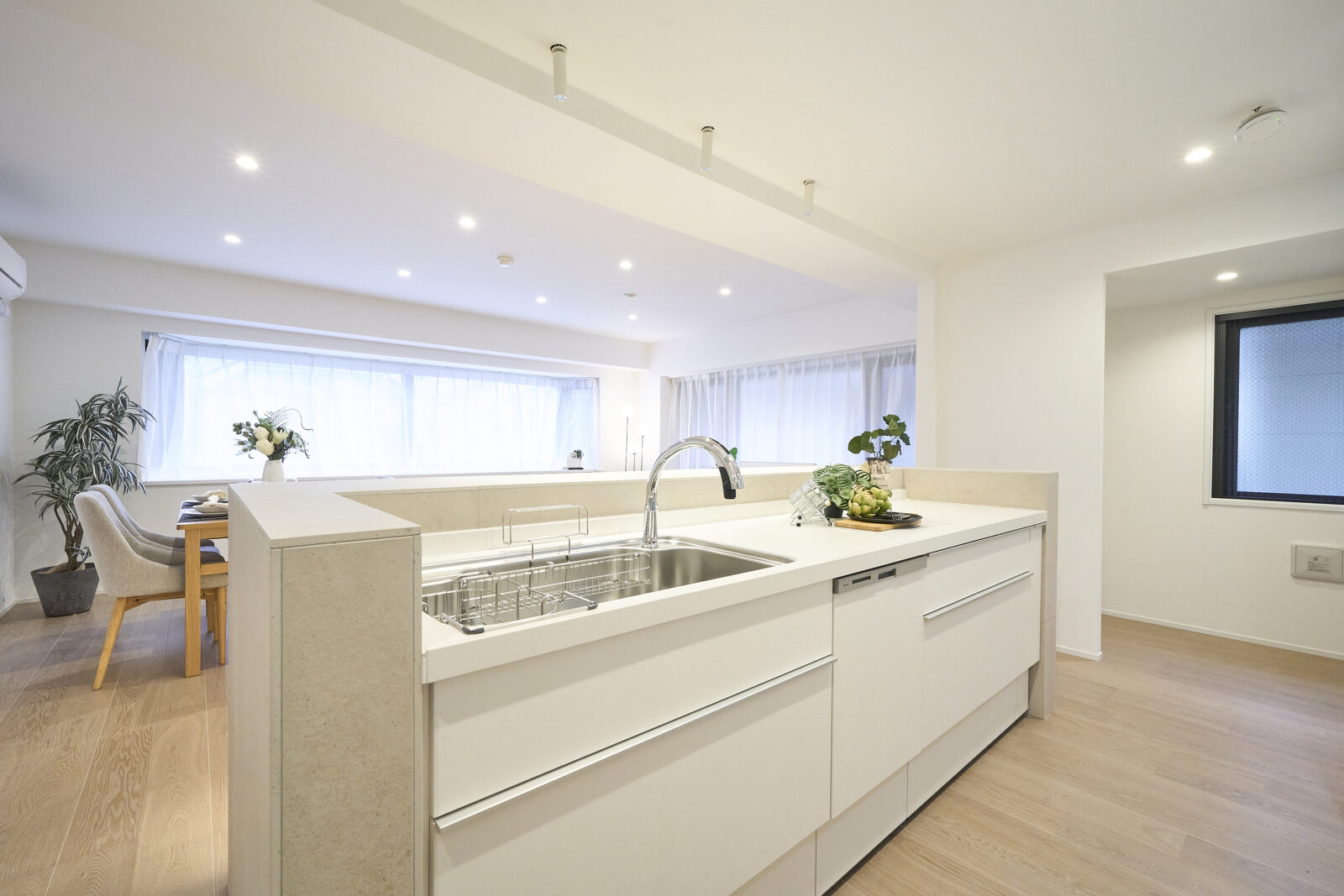 そんな弾んだ声が響くのは、リビングのどこにいても家族の気配を感じられる開放的なアイランドキッチン。 真っ白な玄関で身軽になった家族が、吸い寄せられるように自然と集まってきます。