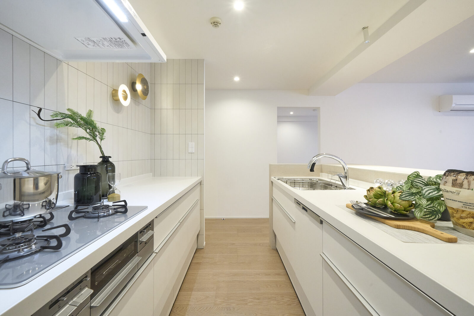 パントリーや収納スペースが確保されており『見せずに魅せる』まさに舞台(ステージ)。お気に入りのアロマやコーヒーの香りが真っ直ぐに届く、清々しい空気感が漂います。さらに、映像付きインターホン、冷房・換気の簡単スイッチでゲストが来た時も安心。