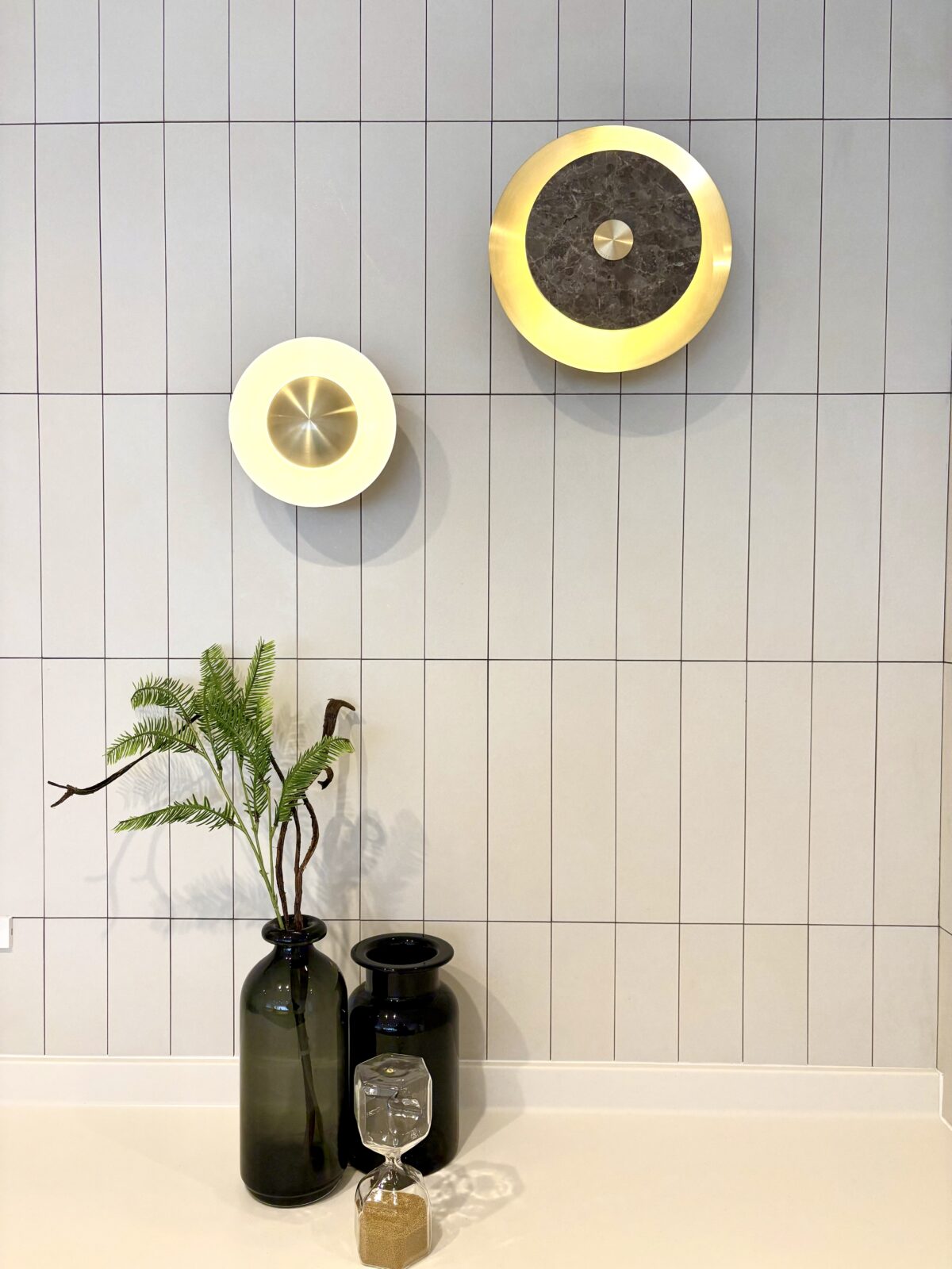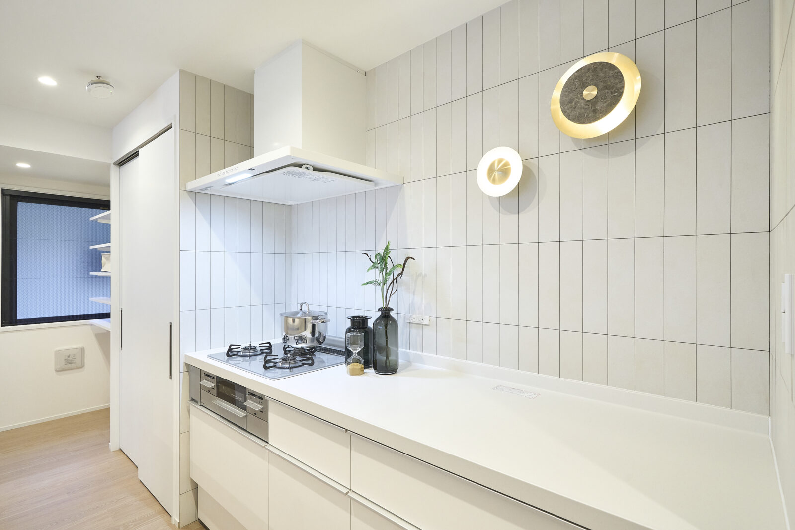 生活感を脱ぎ捨てて進むと、キッチンでは大小ふたつの月の光が照らしてくれます。天然石から漏れる柔らかな光は、タイルの表情とも相まって、一見すると夜空に浮かぶ天体のよう。しかし近づけば、そこには天然石の力強い紋様と、気品ある金属の質感が宿っています。