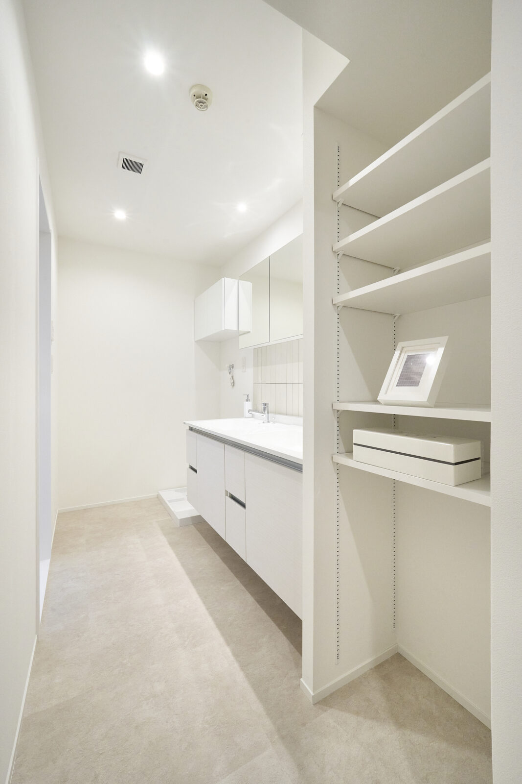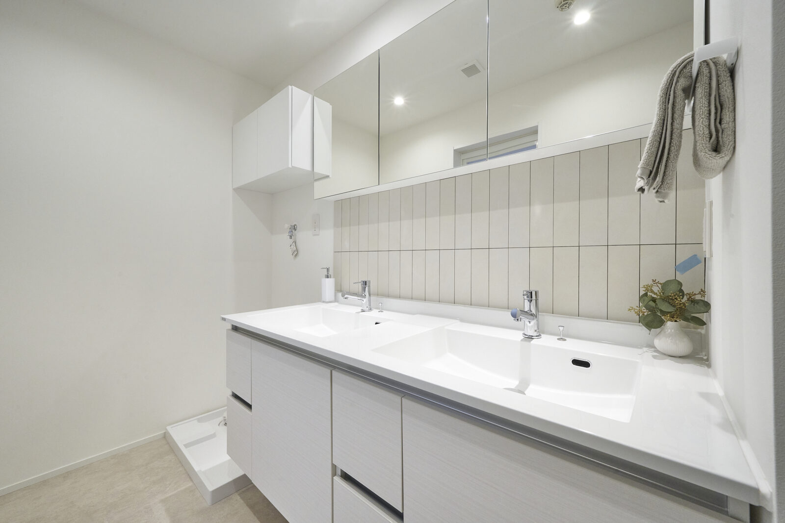 と顔を合わせる朝の洗面室。広々としたツーボウルの洗面台なら、慌ただしい時間帯でも家族が並んで、ゆったりと身支度を整えられます。肩を並べて歯を磨いたり、鏡越しに今日の予定を話したり。物理的なゆとりが、忙しい朝の心に「優しさ」という余白を届けてくれます。正面にはキッチンと同じタイルを採用し、横には収納スペースを設けているので、常にスッキリとした空間を保てます。