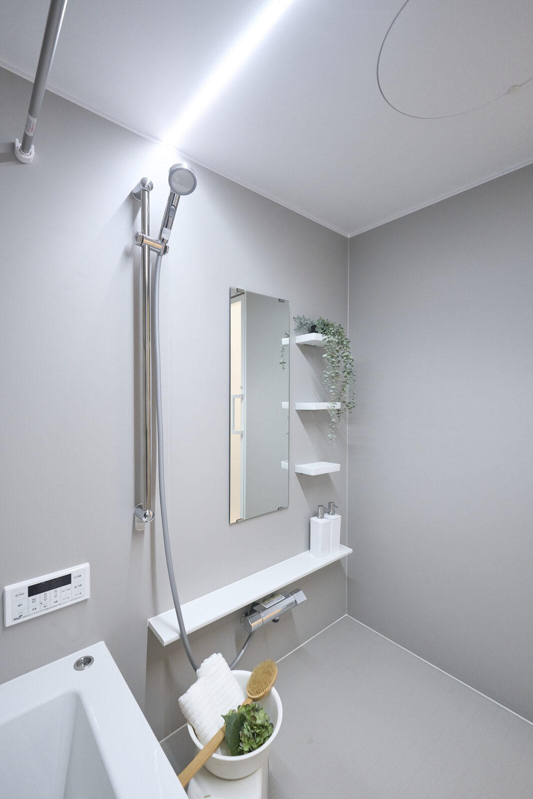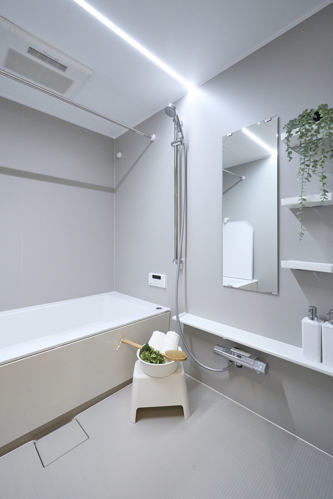 天井を走るライン照明は、その日の気分に合わせて『光の色と明るさ』をリモコンで自由自在に操れます。朝は真っ白な光を浴びてシャキッと目覚め、夜はキャンドルのような温かい色の光に落として、静かな瞑想のひとときを。天然石の照明とはまた違う、現代的で繊細な光の演出が、日常の入浴を特別な儀式へと変えてくれます。