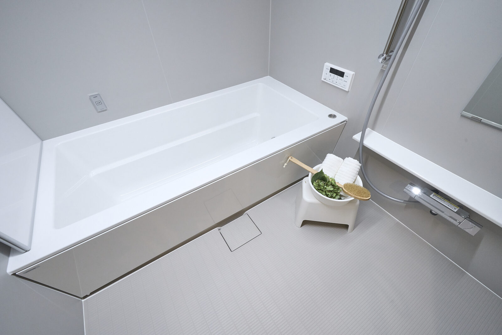 夜ご飯の後は、至極のバスタイム。目に優しく、飽きのこない上品な色彩であるグレーベージュを基調とした浴室は、1620サイズと親子で入っても余裕のある空間です。