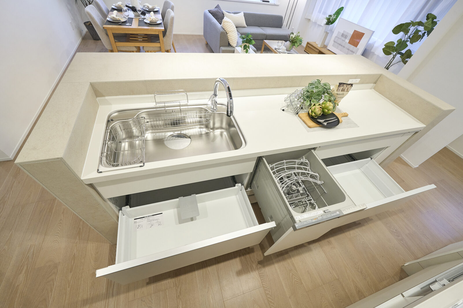 壁のないオープンな造りだからこそ、野菜を刻む軽快な音や、お鍋から立ち上がる美味しい香りが、リビングにいる家族への招待状に。 お料理中も会話が途切れることなく、準備の時間さえもかけがえのない団欒の一部へと変わります。