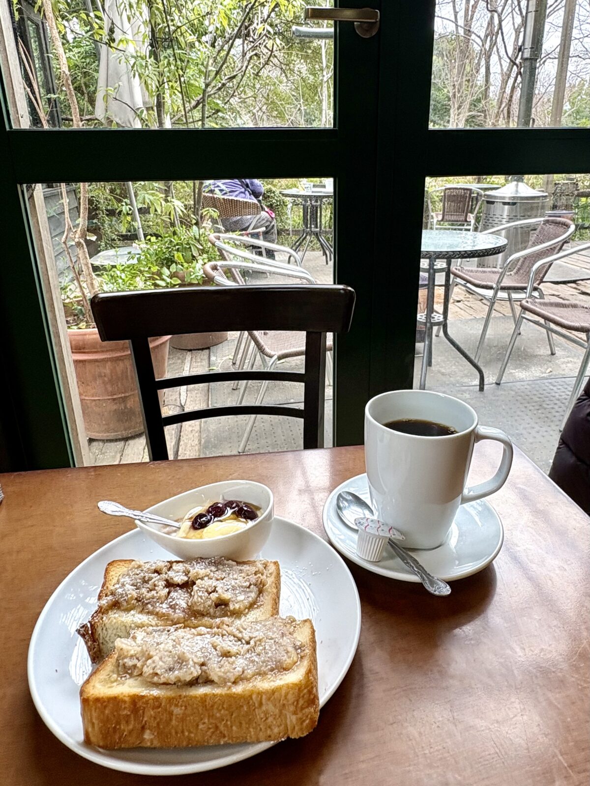 実際にモーニング「クルミバターシュガートースト カフェセット」(¥880)をいただくと、自家製厚切りパンが香ばしく、まさに「サクサクもちもち」。その上にはたっぷりとのったクルミバターとシュガーがほどよい塩味と甘さを引き立ててくれます。コーヒーとの相性も良く、大粒ブルーベリーと贅沢にはちみつがかかったヨーグルトも優雅なひとときを演出してくれます。(自家製パンはテイクアウト用に購入も可。)