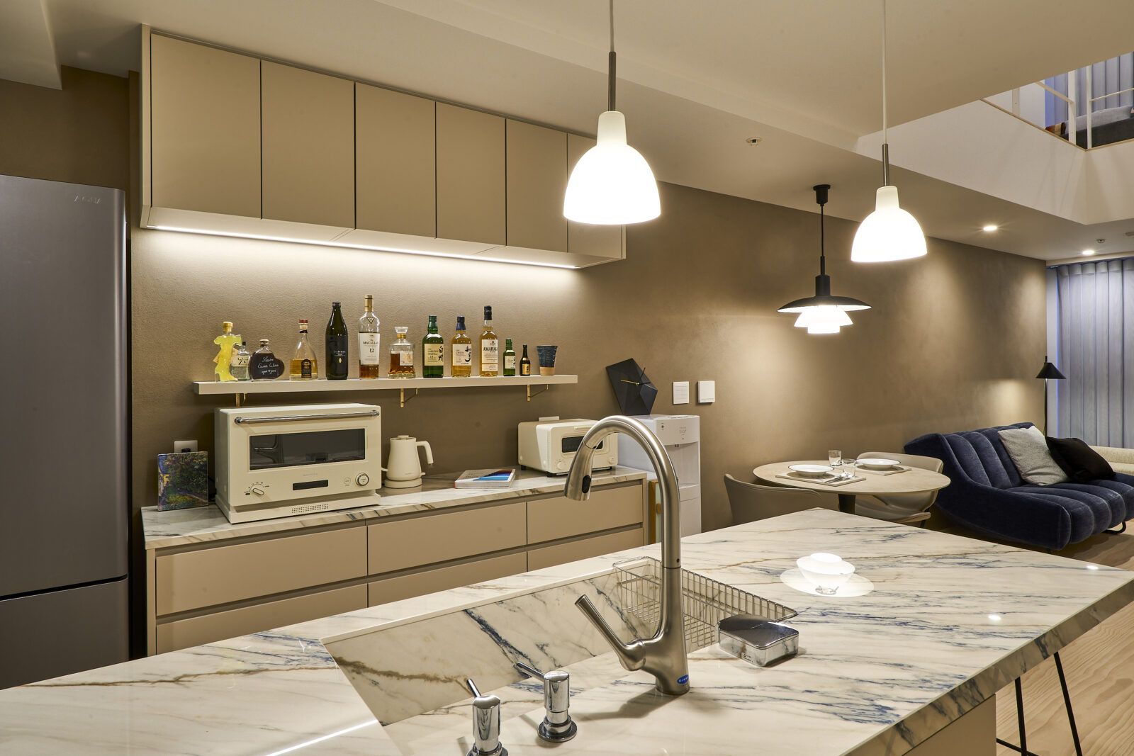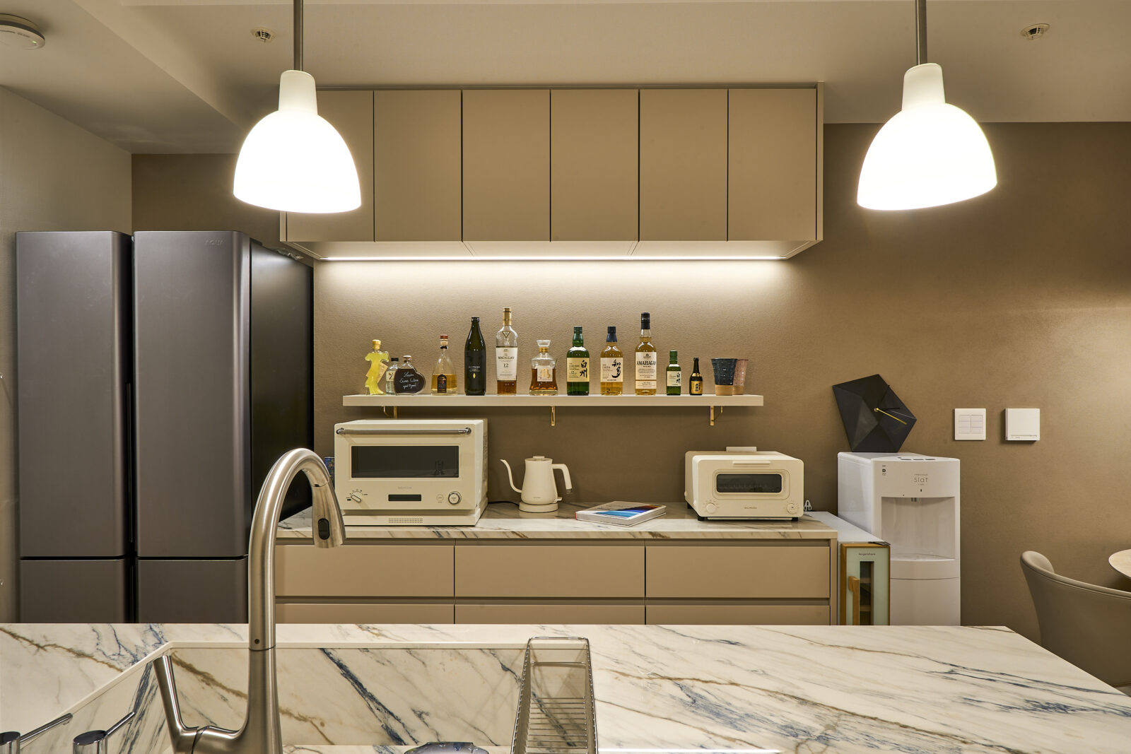 「あとこの雰囲気だよなー。バーみたいだもんなー。カップボードもまたおしゃれだよね。天板と面材が統一感あって落ち着くんだよ。あと!この照明!Louis Poulsenの間接照明はもう。もうね。」