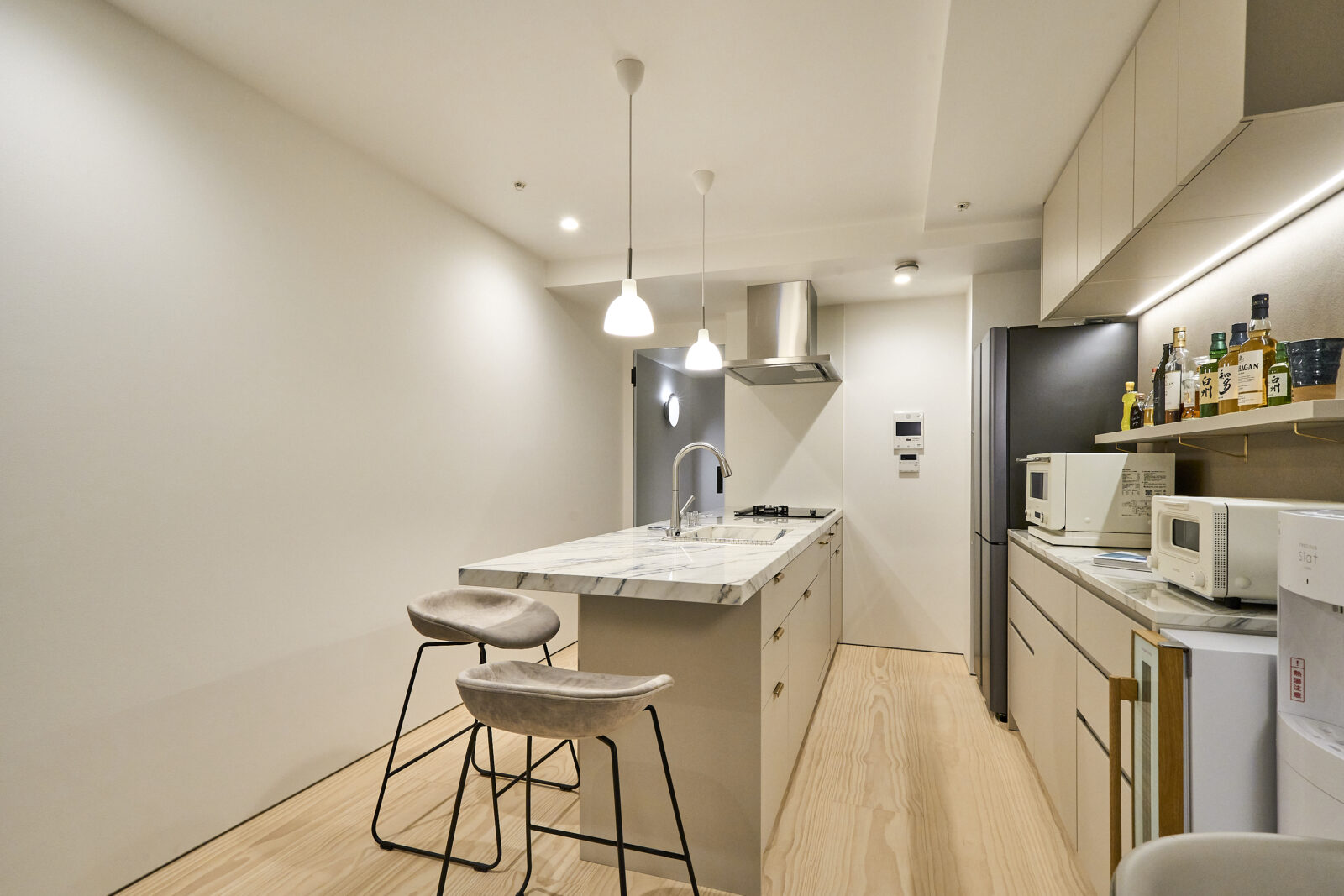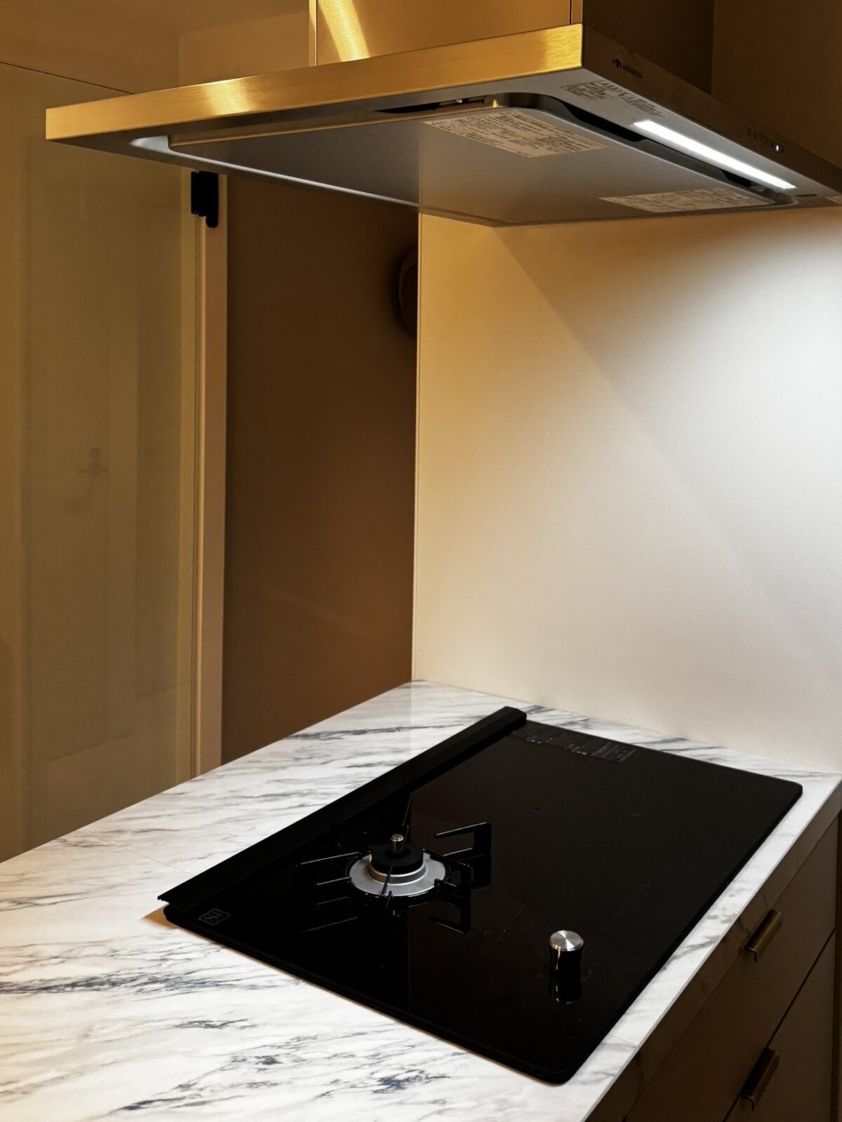「このキッチン、料理しやすいでしょ?IHクッキングヒーターが2つに、1つガスコンロもあるんだから。」