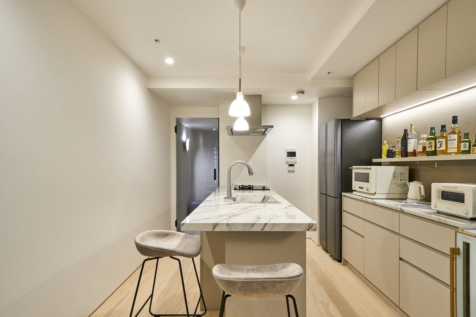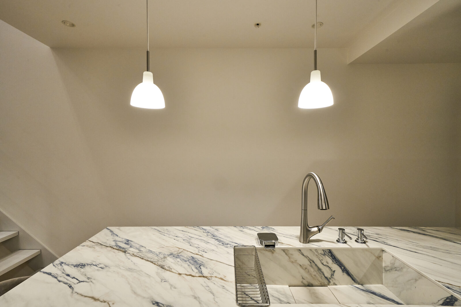 「このキッチンすごくいいよなあ。まずこの天板が高級感ありまくりなのよ。CosentinoのDEKTONでしょ?センスが良い。素晴らしい。何がいいって、シンクの中までこの素材なところだよね。」