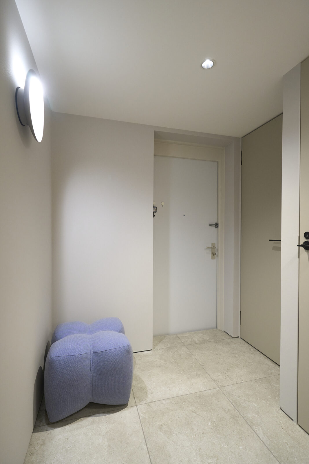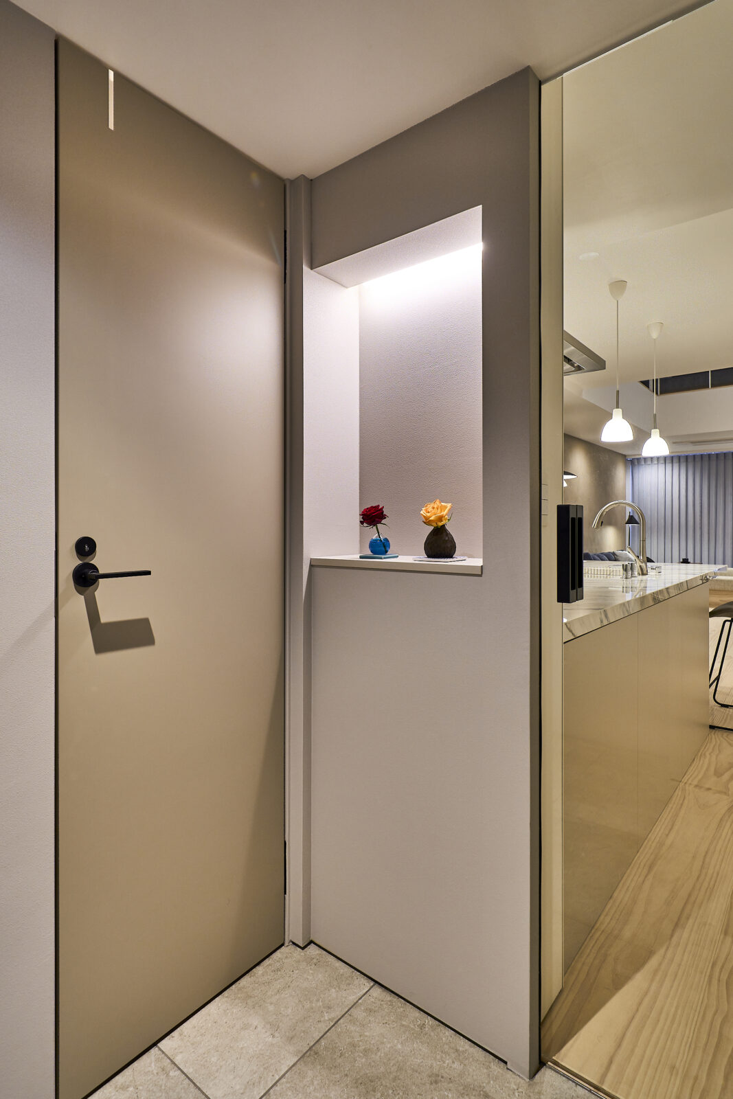 「グレー調の壁紙×グレーベージュの床タイルなんて落ち着いた雰囲気が最高じゃん!帰ってきて第一にささやかながらも幸せを感じられるよ。しかもこのRIVIERA製タイル、600角の大判かつ真っすぐの透視目地張りで高級感に溢れてる。」