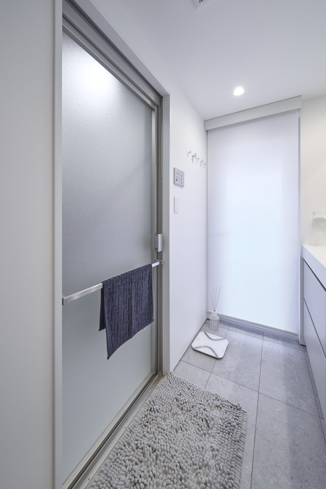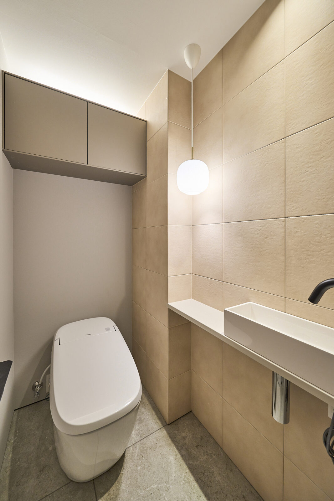「玄関前にあるトイレもそう、グレー系で統一感がありながら、ベージュ系のLIXILアレルピュアの壁紙とペンダントライトが温かみを与えてる。ドアは、手前のSIC(シューズインクローゼット)とあわせてKAMIYAのCUBE。早く帰ってきたくなるよなー。」