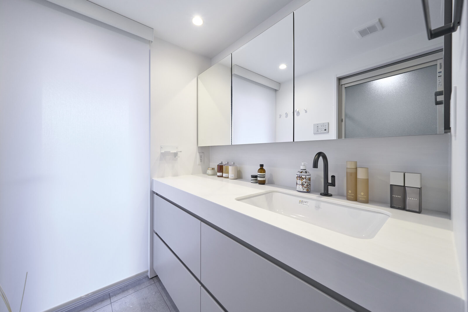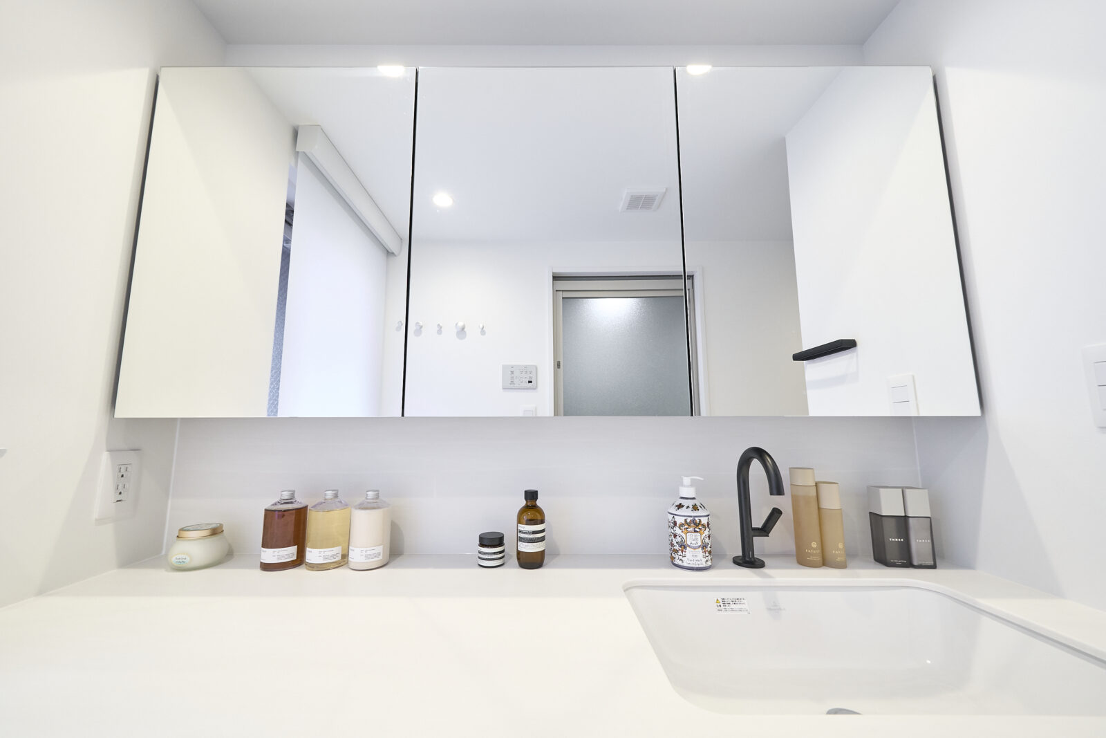 「次!次!この広々とした洗面台で洗顔する瞬間!三面鏡の上下に間接照明があるのもホテルみたいで素敵なんだよ~」