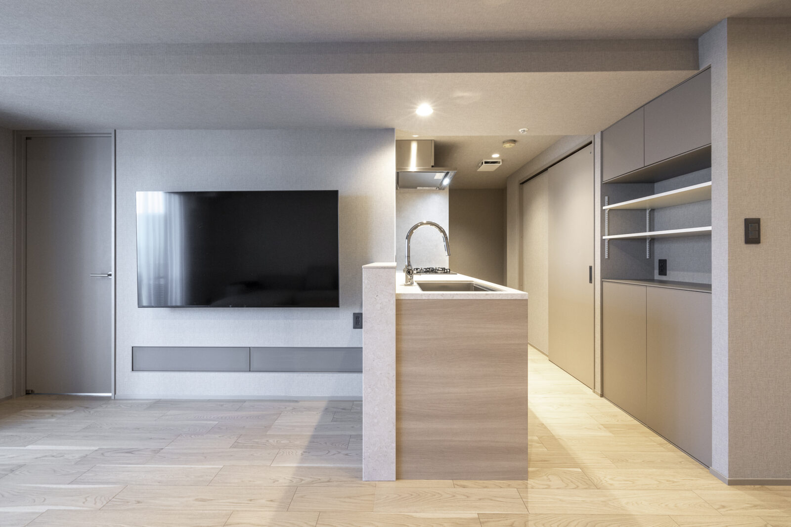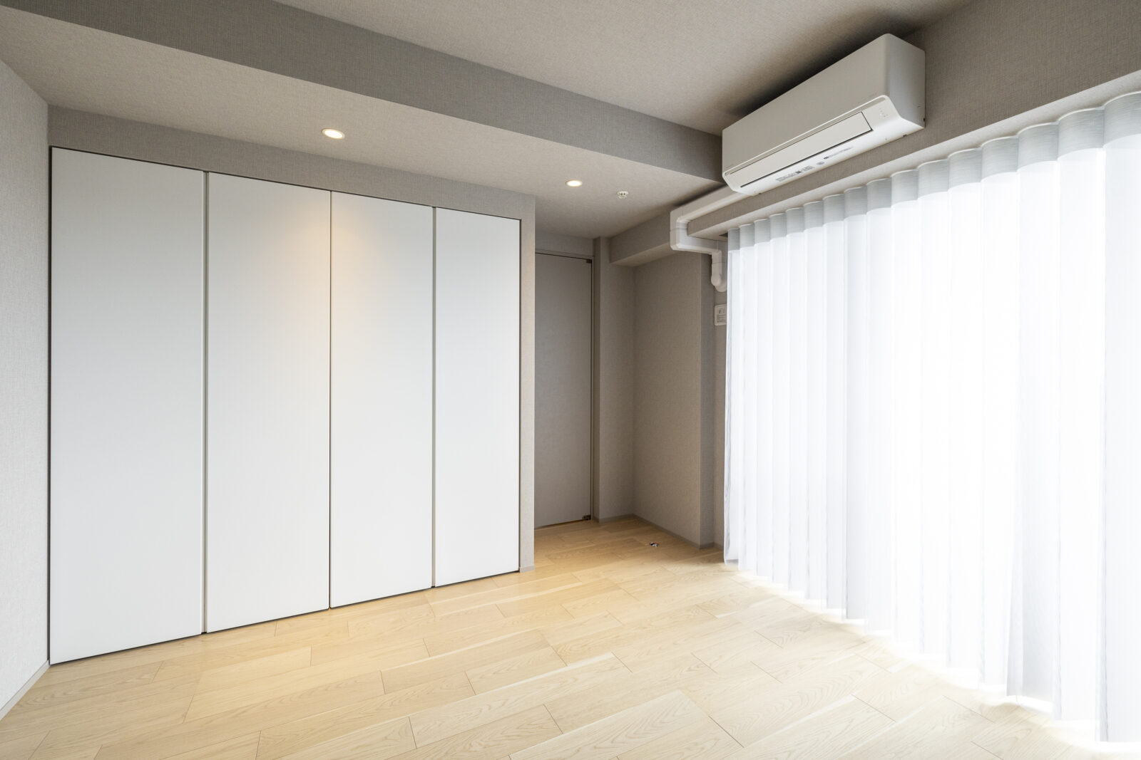 クローゼットの取手と枠を無くし壁面化することで、視覚的なノイズを削ぎ落としている。