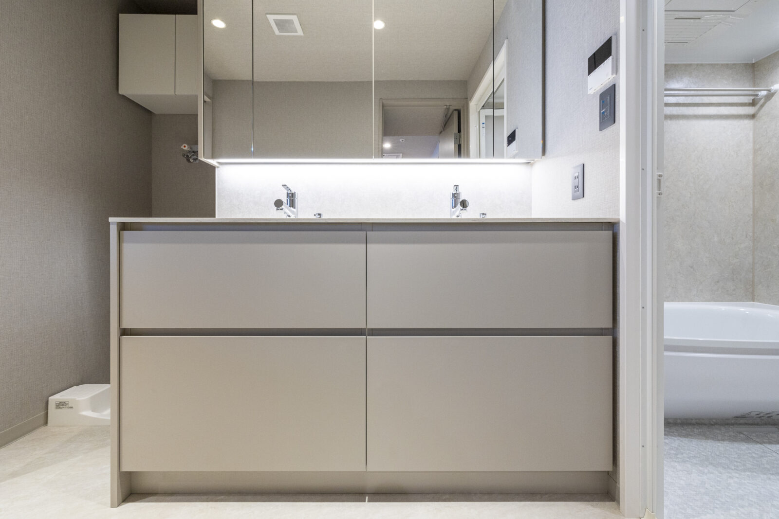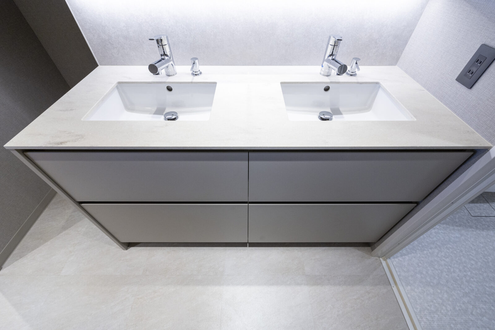 毎日使うものだからこそ、田中工藝によるオーダー品にこだわり、落ち着いた高級感と柔らかさを併せ持つグレージュを採用した。天板には、なめらかな質感が美しいコーリアンを選んでいる。この上質な素材感が三面鏡下の間接照明と響き合い、ホテルライクで優雅な空間を演出する。