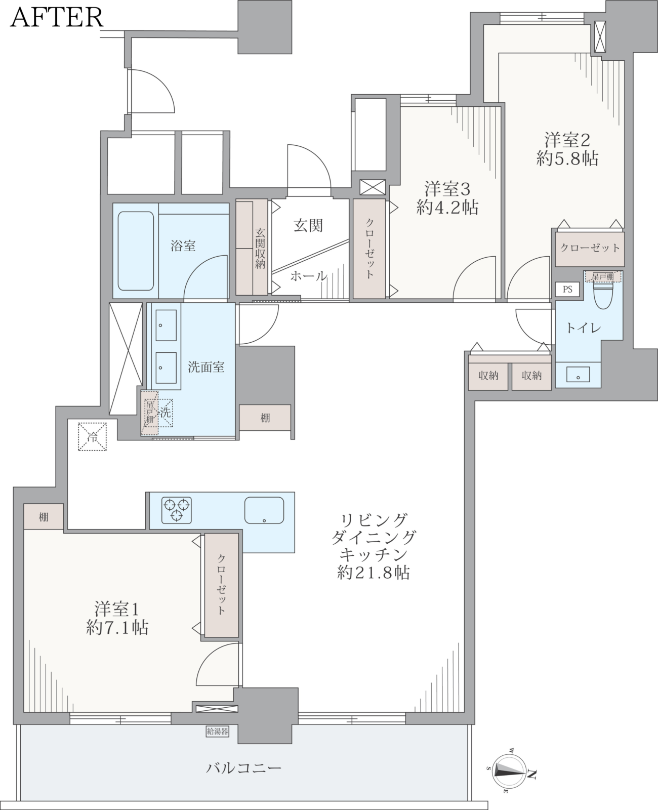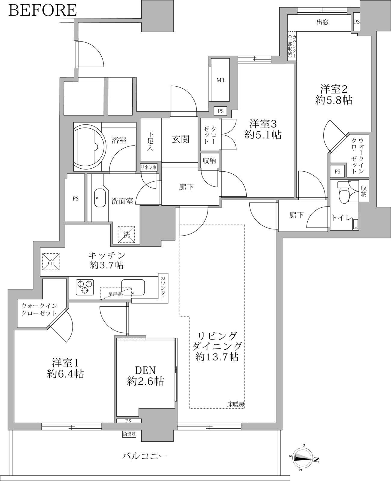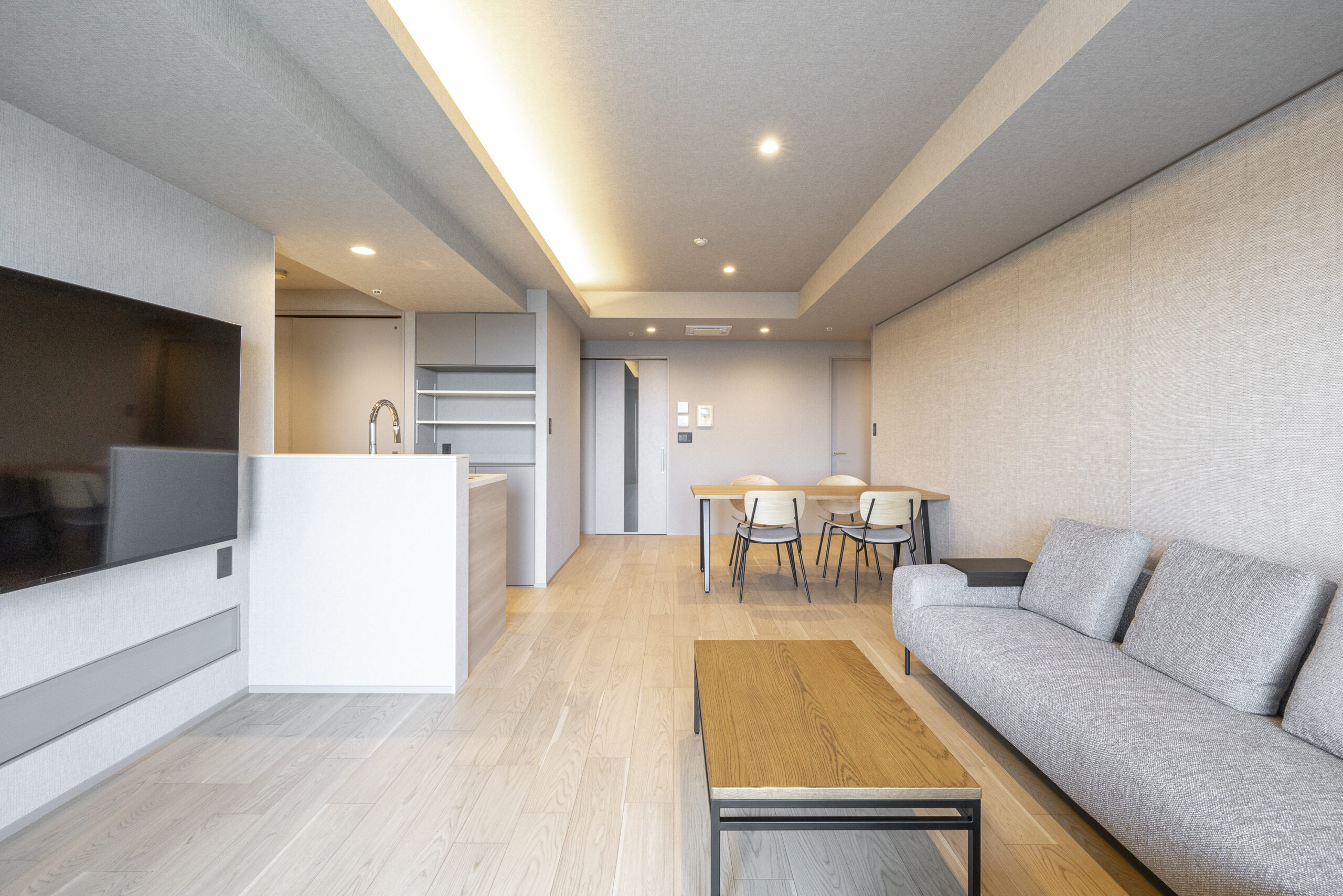 | リノベーション内容 | フローリング新規貼替 建具・玄関収納等新規交換 田中工藝製洗面化粧台新規交換 TOTO製洗浄便座付トイレ新規交換 TOTO製追焚機能付ユニットバス新規交換(浴室換気乾燥暖房機能付) 田中工藝製システムキッチン新規交換(食器洗浄乾燥機付) Panasonic製スマートホームシステム設置 Panasonic製天井埋め込み型空気清浄機設置 壁・天井クロス新規貼替 給湯器新規交換 照明器具新規設置 エアコン新規設置(LDK) |