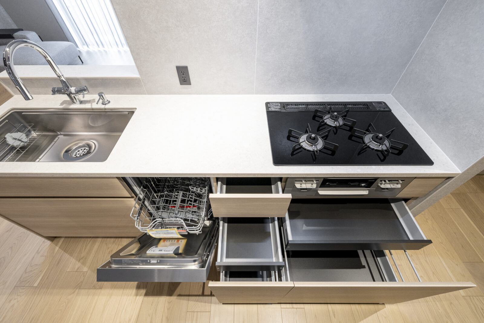 さらに、ディスポーザーやタッチレス水栓、大容量の背面収納を完備。