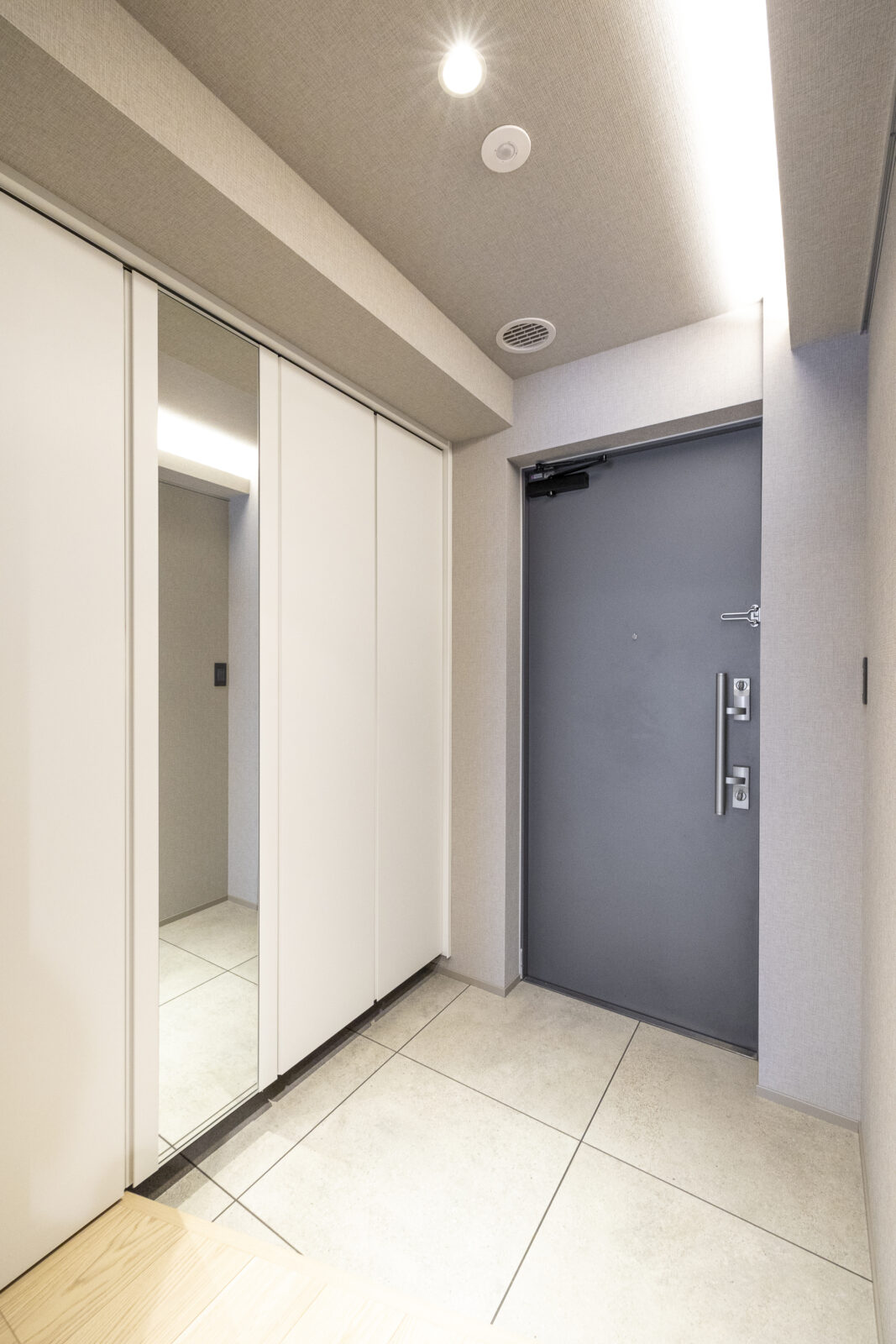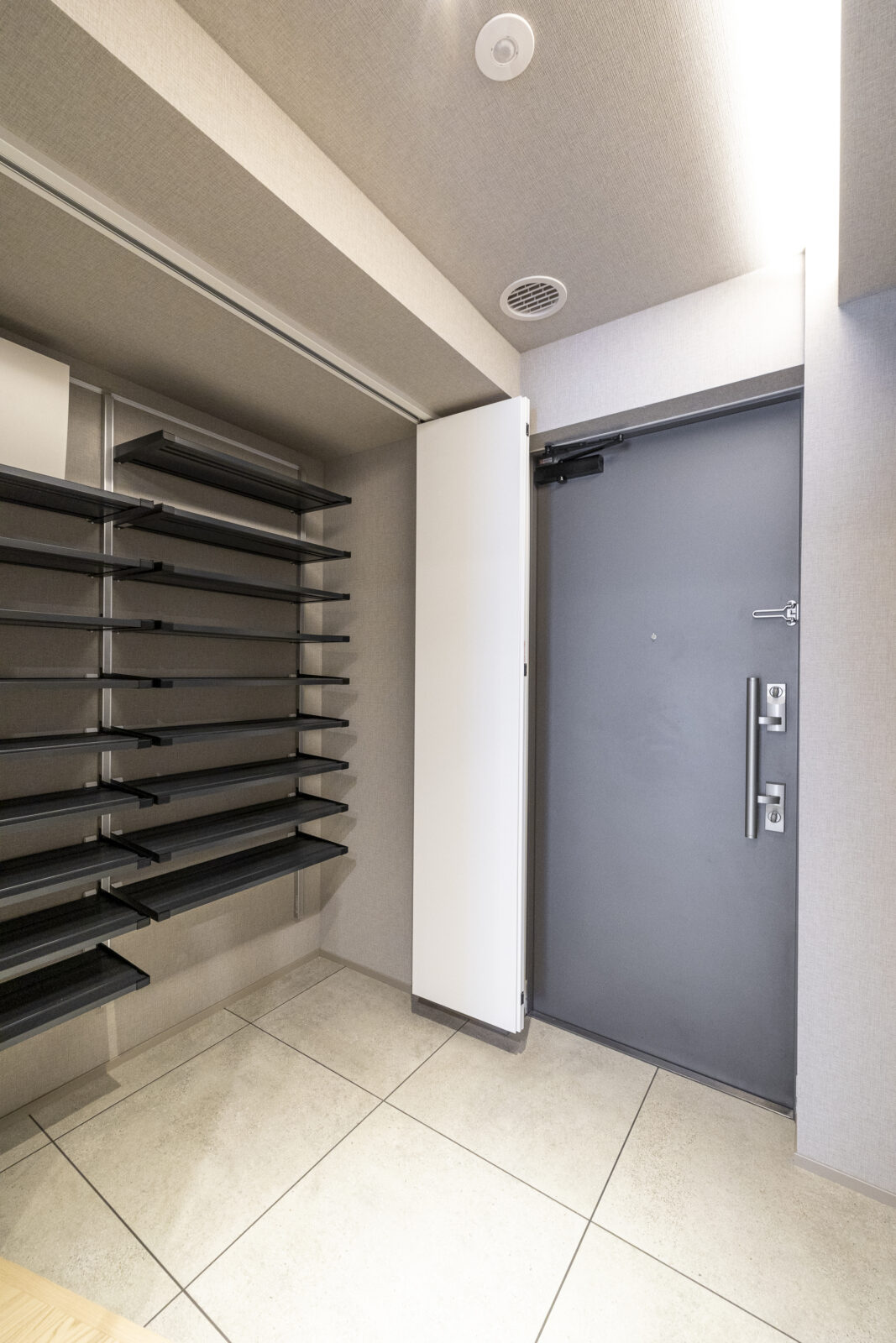 足元には大判のタイルを採用。継ぎ目を少なくすることで、視覚的な広がりを持たせた。斜め框が生んだゆとりある土間スペースは、大容量の玄関収納と相まって、複数人が同時に身支度をしても窮屈さを感じさせない。この「広さ」への配慮が、心に余裕を生み、所作までも美しく整えてくれる。