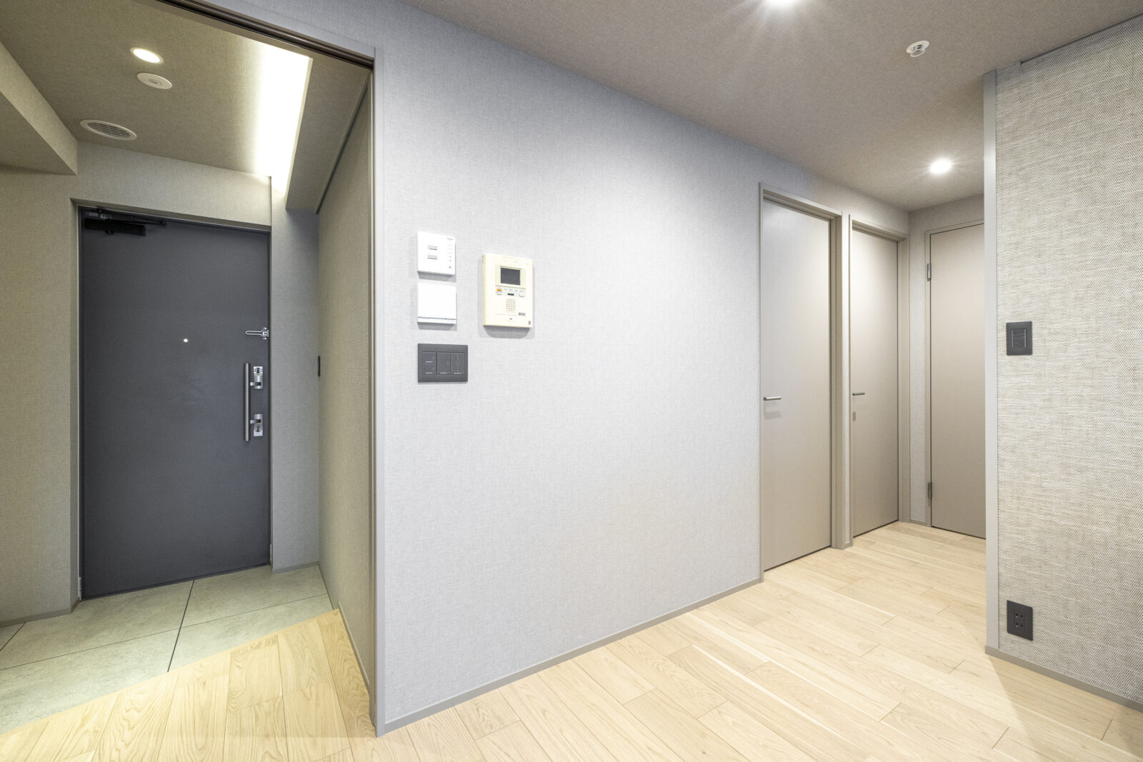 一歩足を踏み入れた瞬間に感じる、突き板フローリングの柔らかな質感と、壁一面に施したアクセントクロスの洗練された表情。