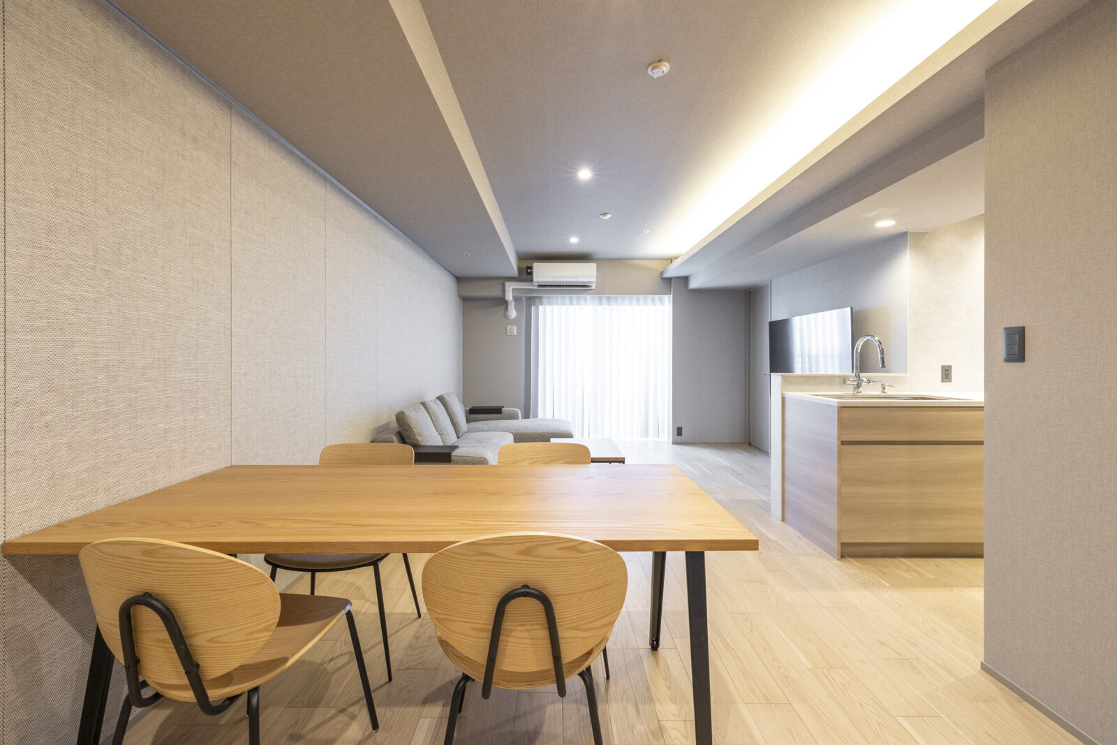 天井を走る間接照明の柔らかな光が、外での緊張を解きほぐしてくれる。
