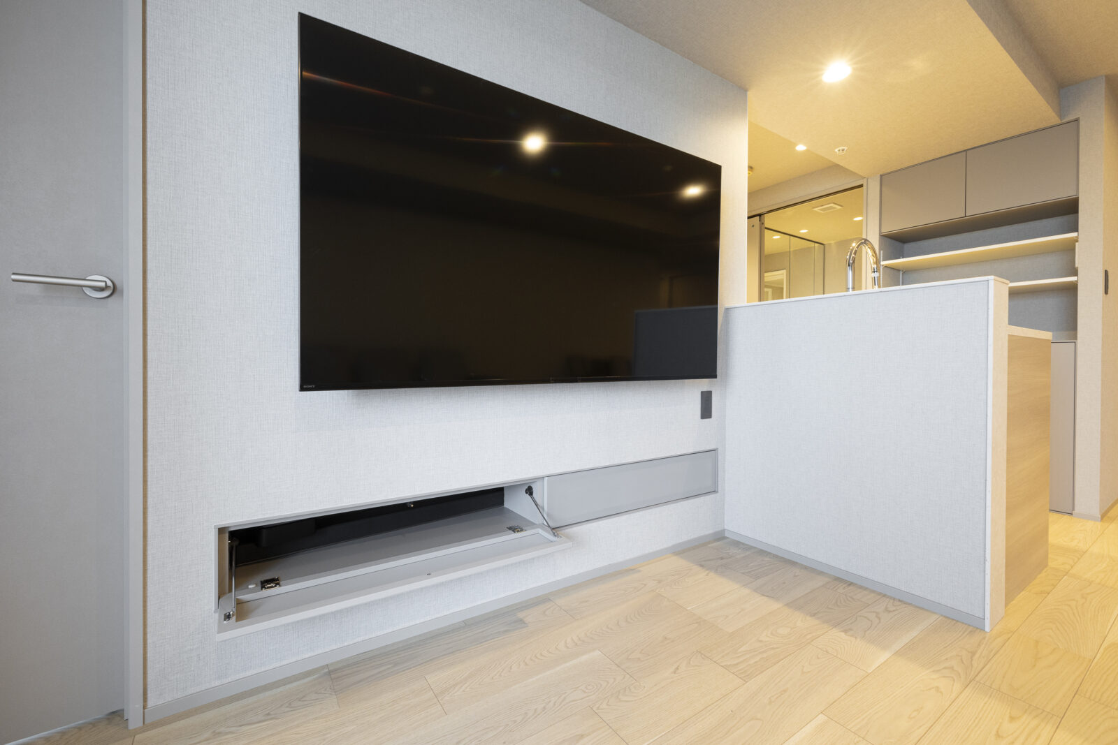 テレビ下には埋め込み型のオーダー収納を設置し、ゲーム機などを隠して収納。